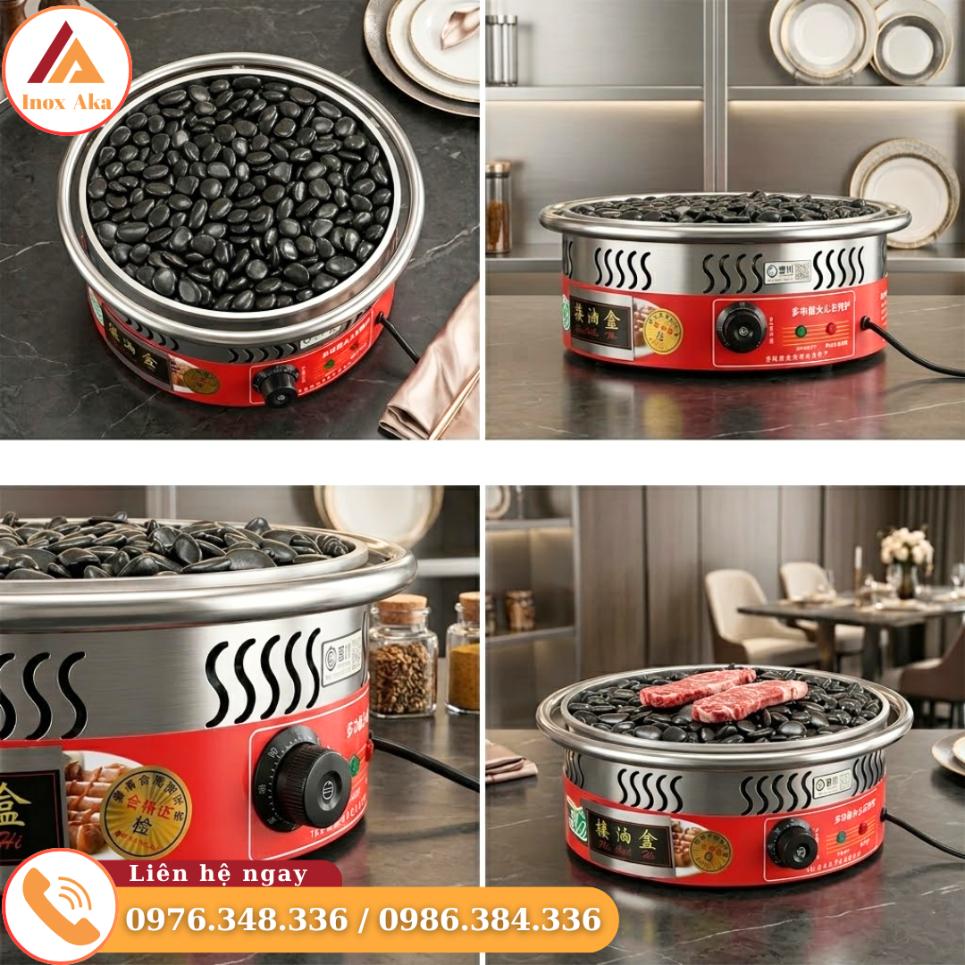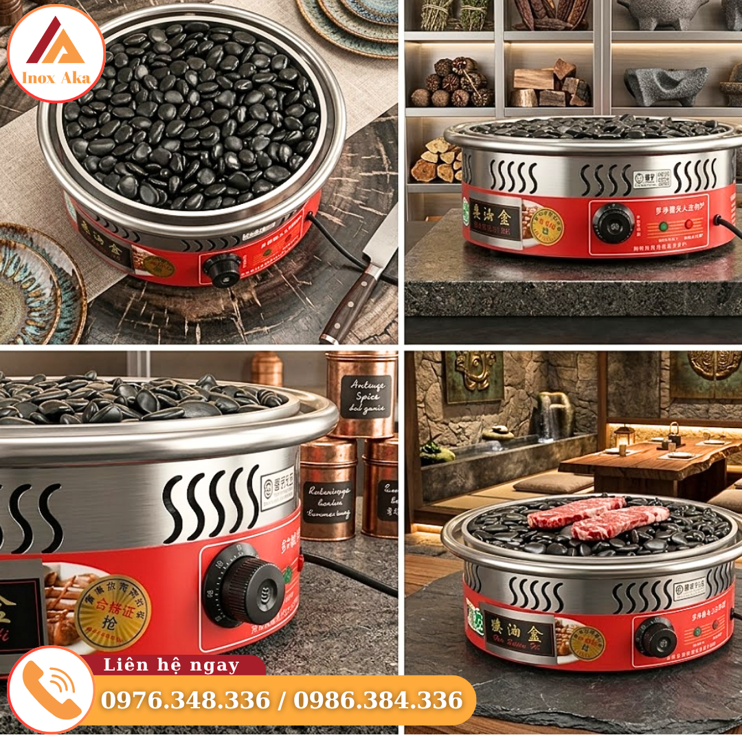 Về nguồn nhiệt, bếp điện phù hợp nơi có điện ổn định, sạch sẽ và dễ dùng; trong khi bếp gas linh hoạt, thích hợp bán hàng lưu động. Ngoài ra, nên ưu tiên khung inox 304 bền bỉ và đá núi lửa chất lượng để đảm bảo an toàn và hiệu suất nướng.