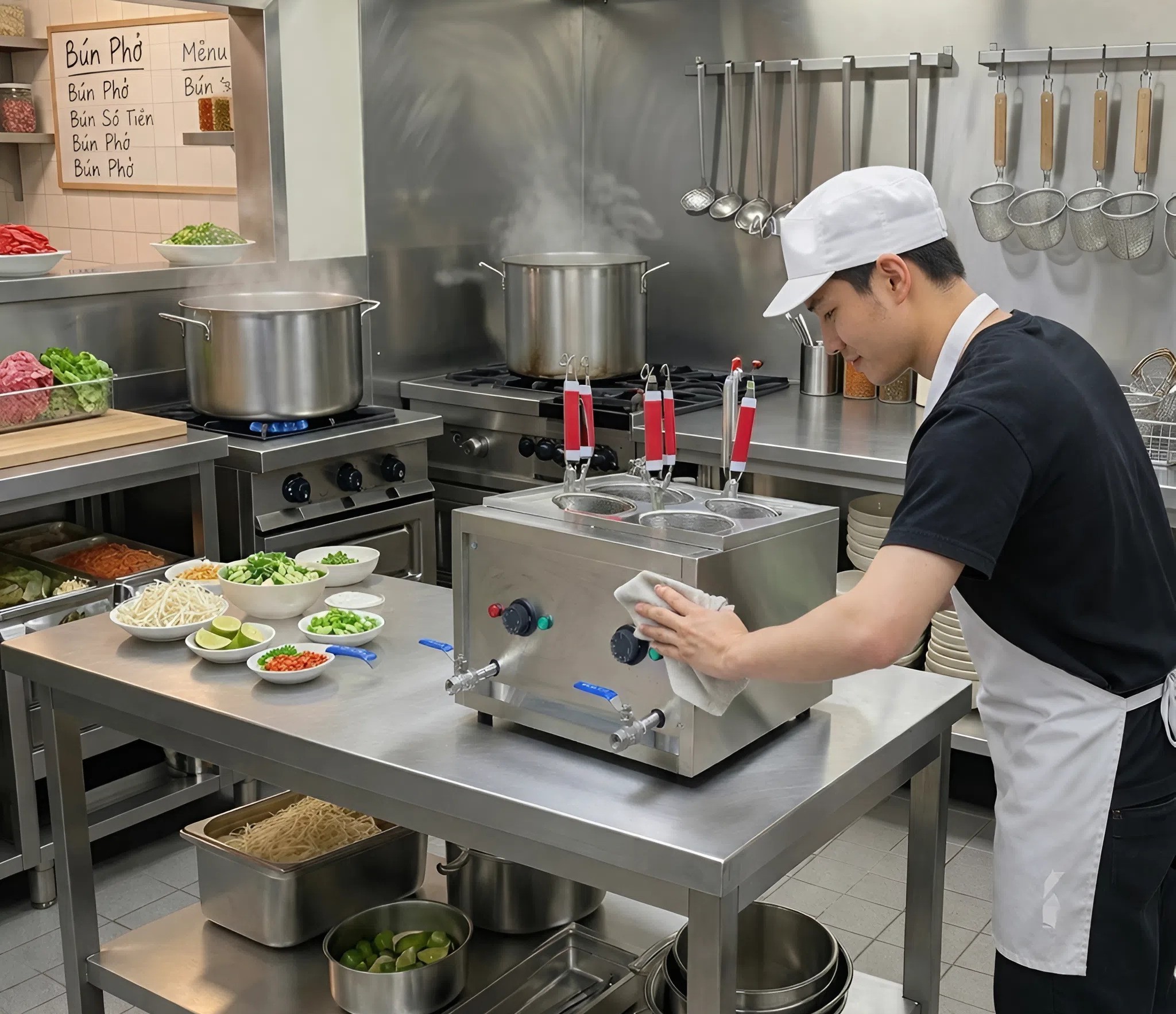 Bếp trụng mì 4 hộc dùng điện – Giải pháp tối ưu năng suất cho quán bún phở, nhà hàng