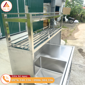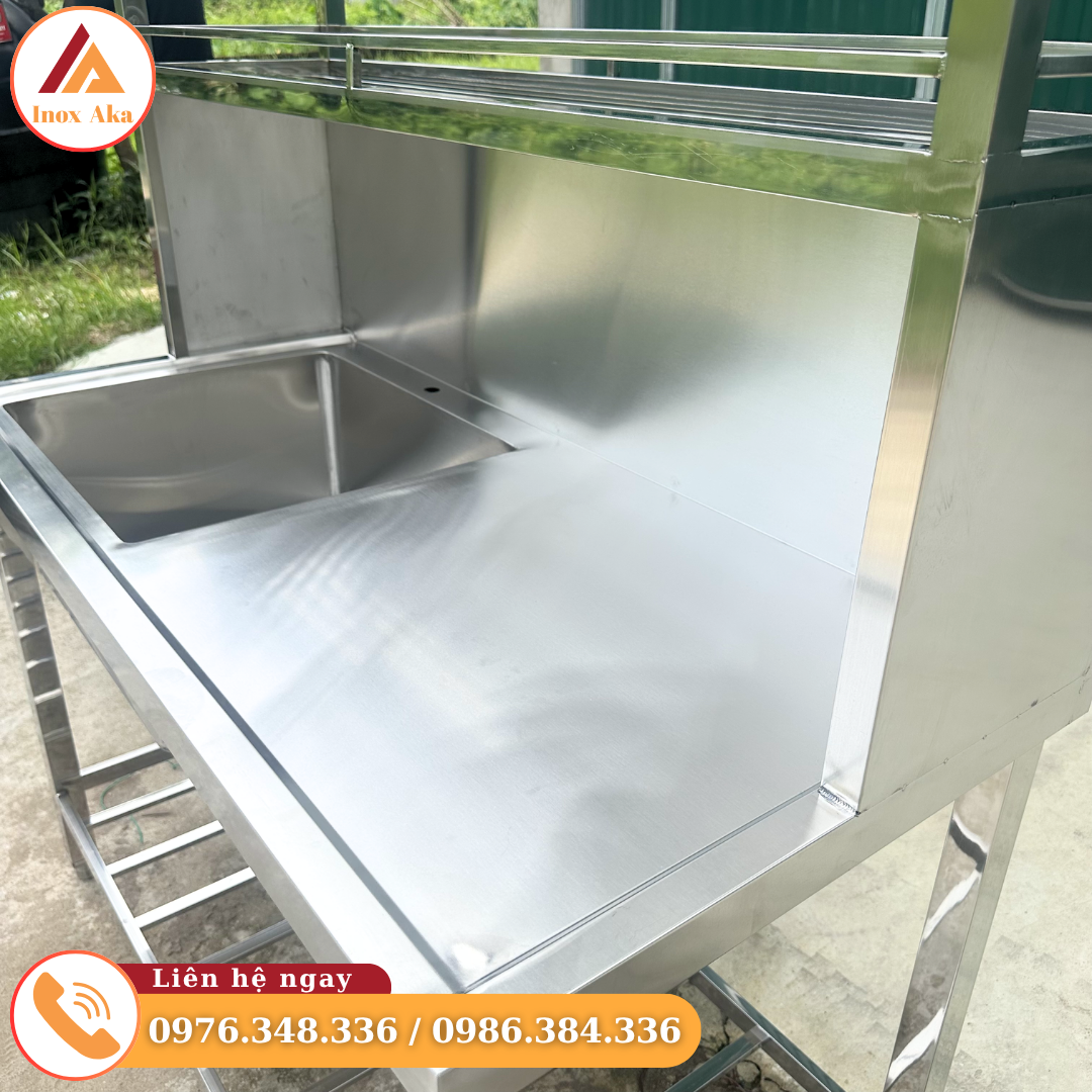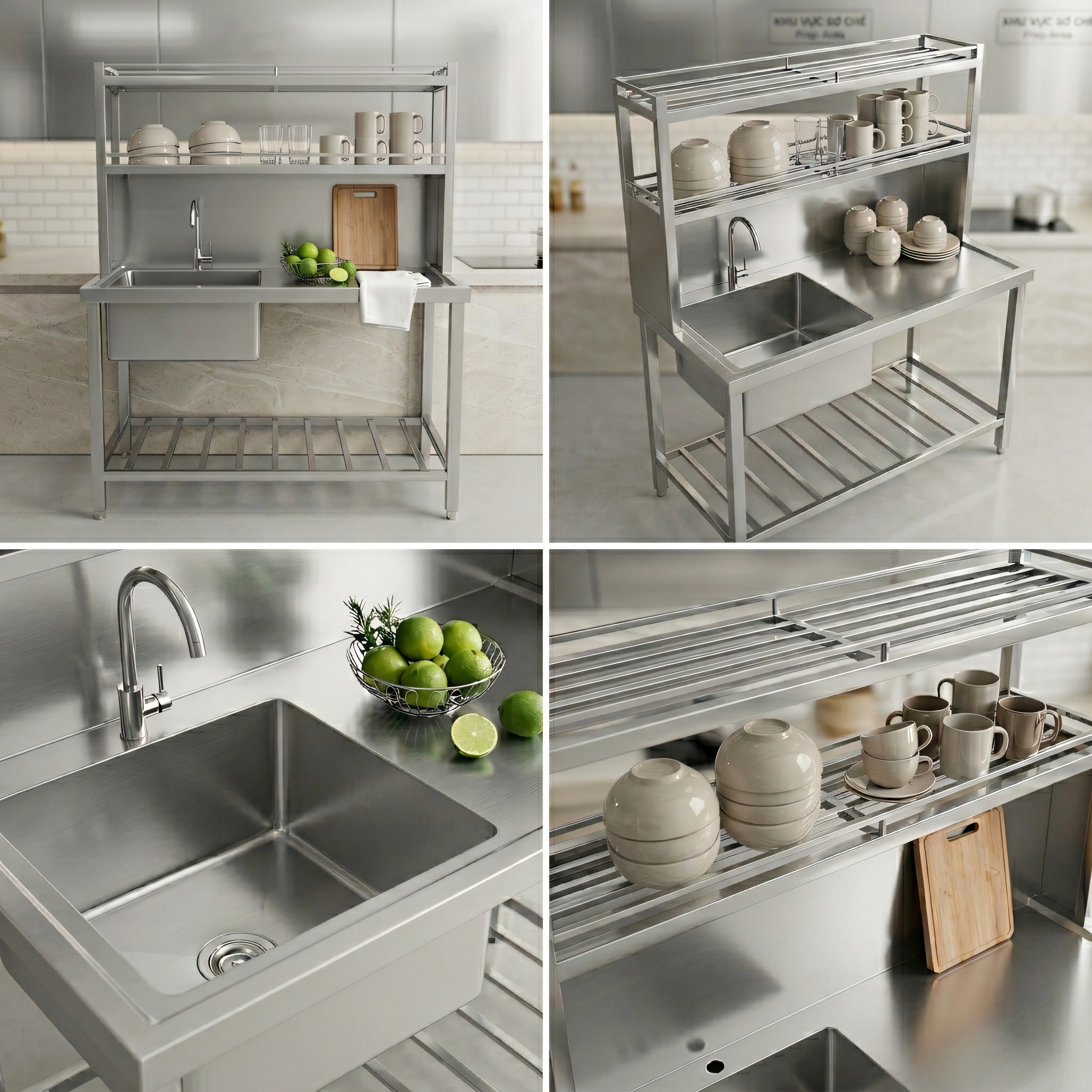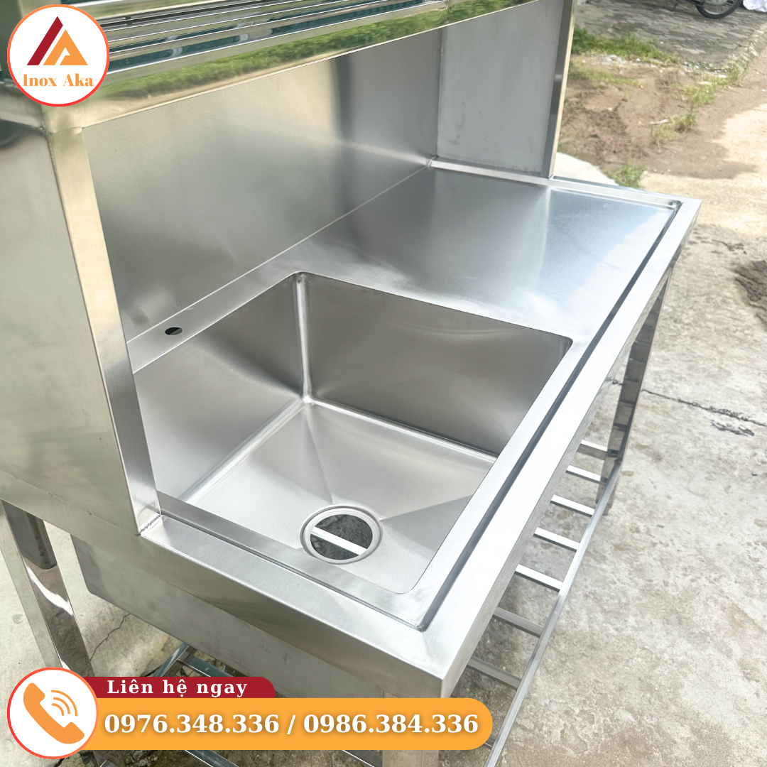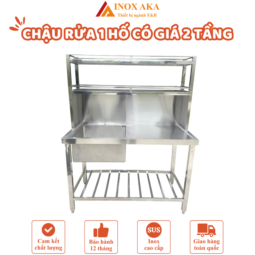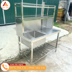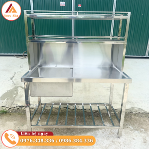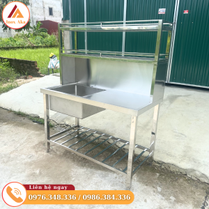 Chậu rửa inox 1 hố có 2 tầng giá là dòng thiết bị chuyên dùng trong bếp công nghiệp, được thiết kế gồm một hố rửa sâu và hệ thống kệ trên dưới tiện dụng. Với cấu trúc thông minh, sản phẩm cho phép người dùng thực hiện các thao tác rửa, để ráo và lưu trữ ngay trong cùng một vị trí, giúp tiết kiệm diện tích và nâng cao hiệu quả vận hành.