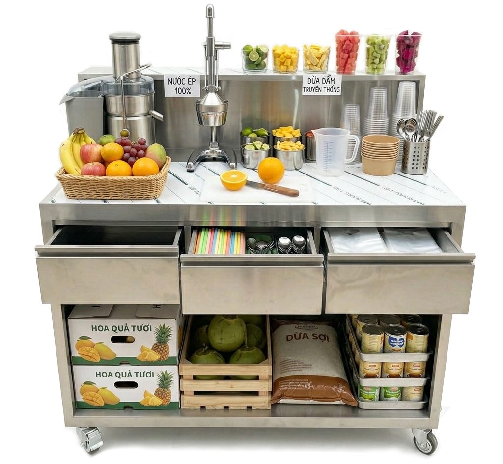 Quầy bán hàng được trang bị nhiều ngăn kéo để chứa dụng cụ như muỗng, ống hút, ly nhựa. Bên dưới là khoang chứa lớn để bảo quản nguyên liệu như trái cây, dừa, sữa hoặc các vật dụng cần thiết.